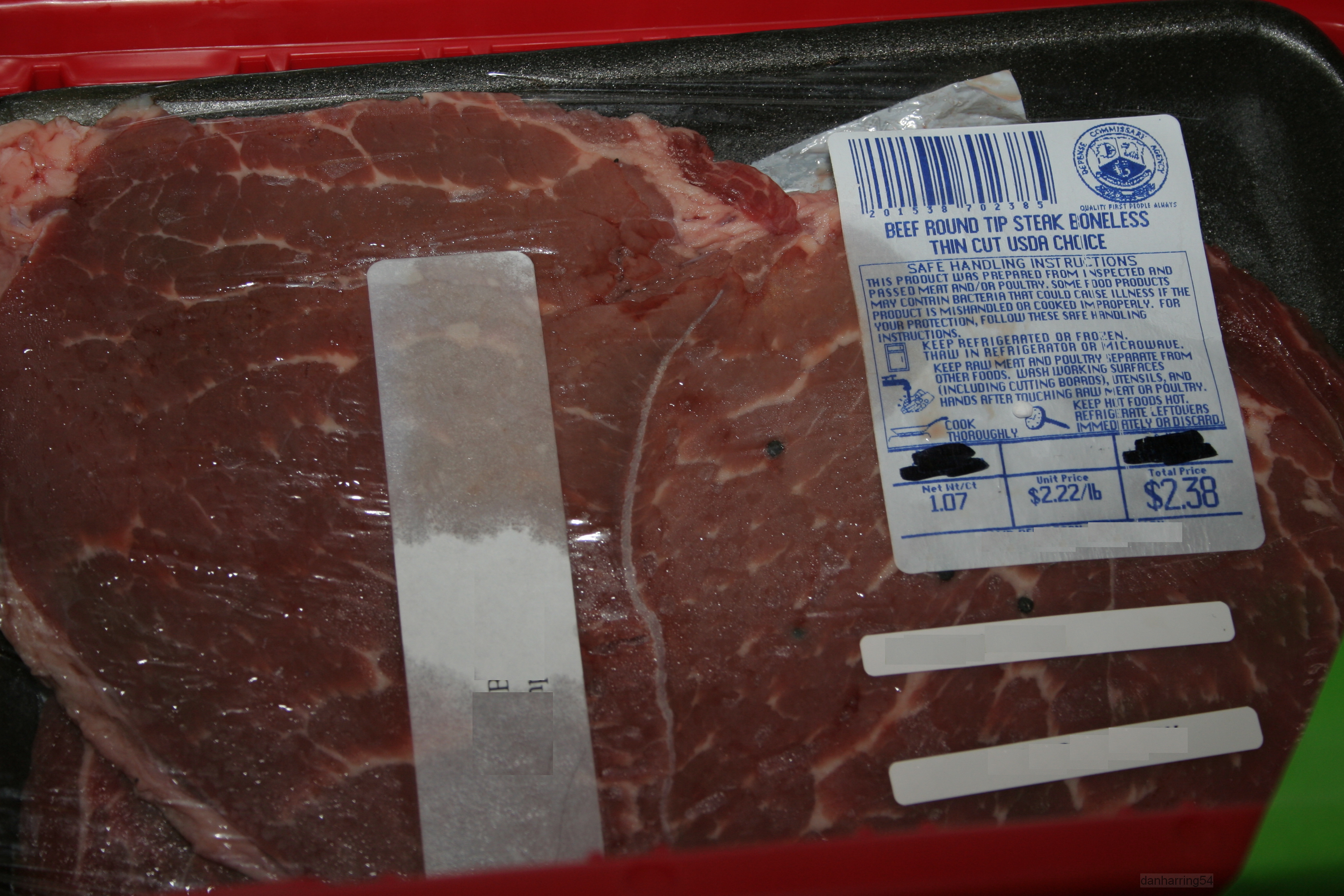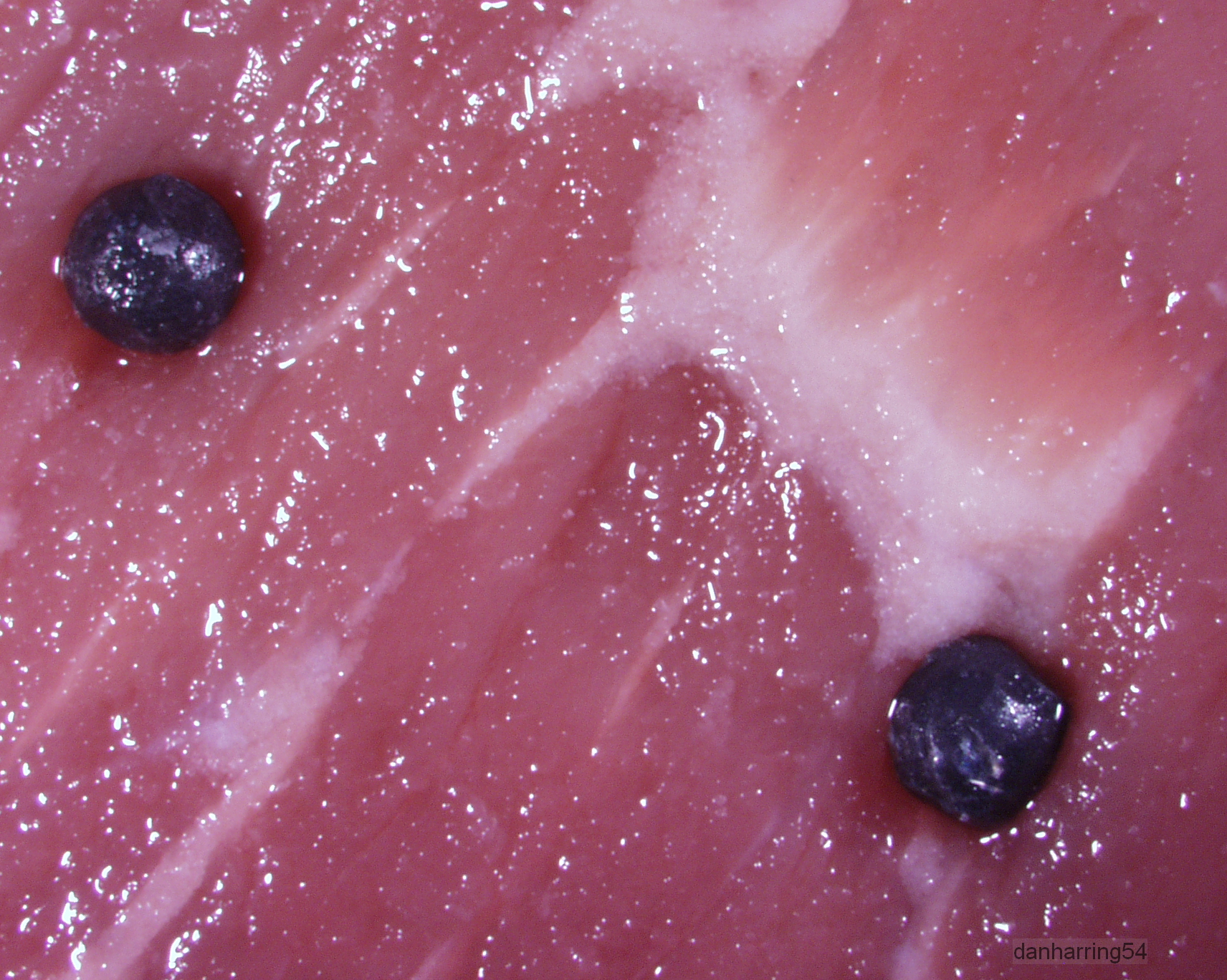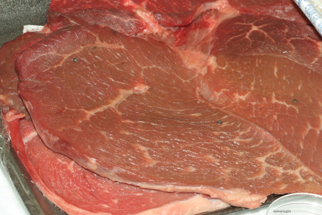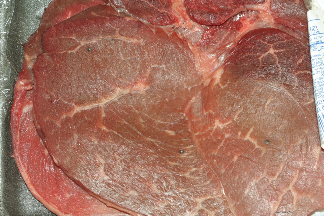 Most recent incident – beef round tip steak thin cut in unopened packs, Four pellets are visible in the first package shown below. (Click twice to enlarge, use browser back arrow to return)