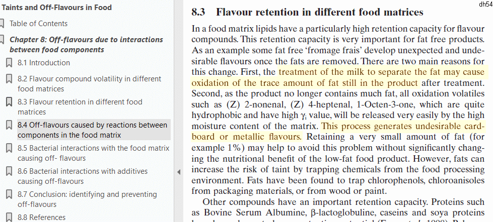 Metallic flavor in milk: during processing the fat can become oxidized. Some of the 8, 9, and 10 carbon scission or cleavage products with double bonds have unusual odors (e.g. cucumber, mushroom, metal). 1-octen-3-one in particular has an unusual metallic note. It is more noticeable (has a lower flavor detection threshold) in reduced fat milk, because there is less milkfat to cover up the taste of the breakdown products. This is different from canned milk (or dairy plants with rusted steel), which have a measurable increase in iron.