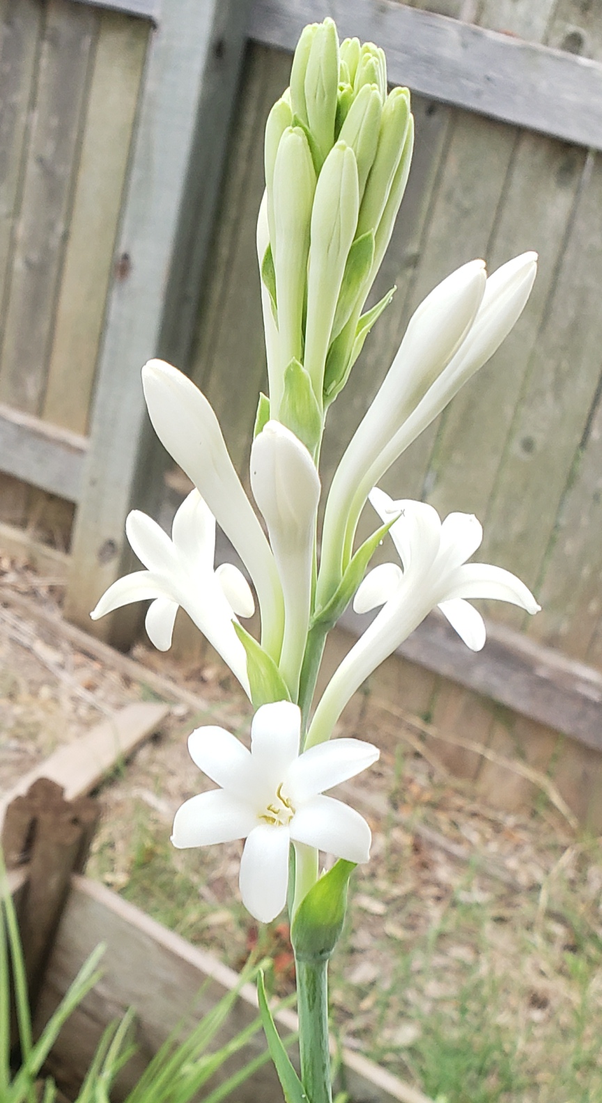No botanical relation to rose. Exotic intriguing aroma, once called the harlot of perfumery. The scent can ‘waft’ a full 30 feet; not as far as Sweet tea olive, but more than most. When the stalk comes into bloom, each of the dozen or more thick waxy flowers opens successively days apart, and it emits the fragrance for several weeks. My first bulbs came from Burpee, then got more from Tennessee Tuberose. It has a slightly medicinal off-putting camphorous note (reminiscent of Vick’s Vaporub and various Tiger Balms, which seems out of place in typical pleasant floral scents – it both pulls and pushes). It’s easy to grow here, but not all of them have bloomed every year. It’s native to Central Mexico (not so far south of here). I had one stalk come into bloom for several weeks in November this year (2025), with 2 more at the end of December, before we got our first hard freeze. Depending on whether it’s day or night, and during the warm steamy season or a cool dry month, the aroma is always intense but has a different character. When half a dozen are in full bloom during warm humid days a few hours after sunset, it is overwhelmingly pleasant.