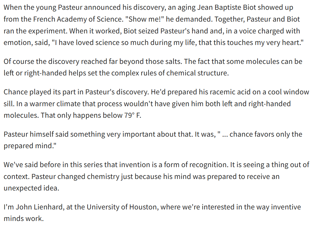 Louis Pasteur – 30 years before his success with anthrax and rabies vaccinations, the chemist discerned that tartrate crystals can occur in two mirror image forms that rotate polarized light beams in different directions. In 1848 the 25 year old Pasteur stunned the aging inventor of the polarimeter (Biot), who had skeptically demanded meticulous proof of his claim. At that early stage, scientists had no clue what organic molecules looked like and how the atoms were connected. (This was 17 years before Kekule published on the benzene ring, inspired by his famous dream of a snake biting its own tail in 1865. Tetrahedral carbon was first proposed in 1874.) https://engines.egr.uh.edu/episode/604