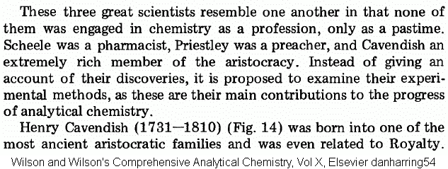 A bit about Cavendish. Wealthy, painfully shy, single-minded devotion to pioneering research. He made some amazing findings, given the limited tools available in those early days.